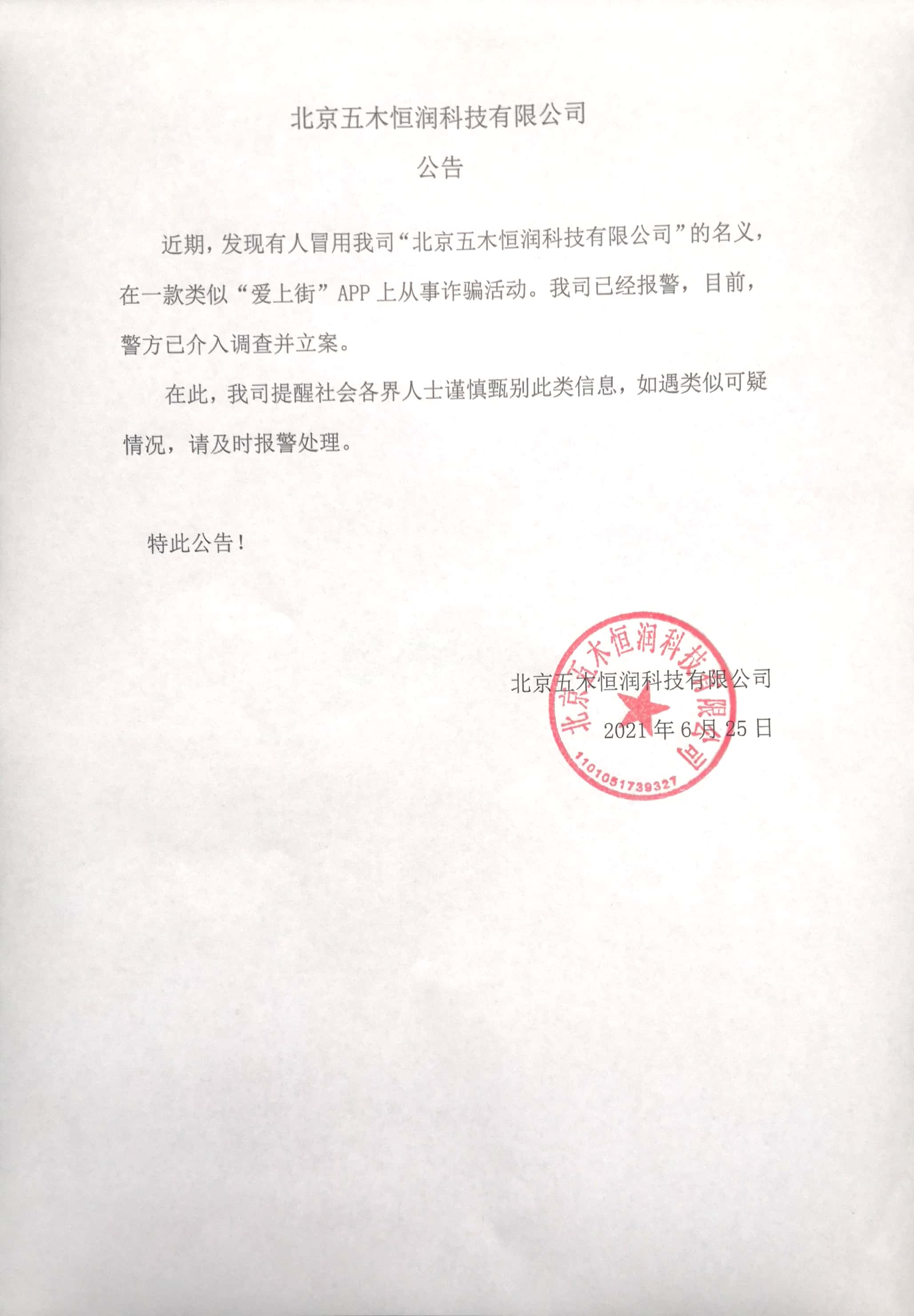 公告:北京五木恒润科技有限公司最新公告